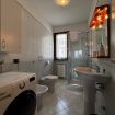 Il bagno ha una doccia con con box in vetro, WC, bidet, lavello e lavatrice.