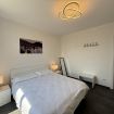 The master bedroom overlooks the garden and has a standard double bed, a wardrobe and a desk.