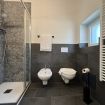 The apartment has two bathrooms, both complete with sink, toilet, bitet and shower with glass enclosure.