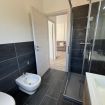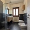 Il bagno ospita una doccia con box doccia in vetro, lavabo con specchiera, WC e bidet.