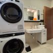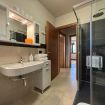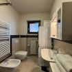 Il bagno ha lavabo con specchiera, WC, bidet, doccia con box in vetro, lavatrice ed asciugatrice.