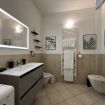 Il bagno ha una doccia con box in vetro, lavabo, wc e bidet.